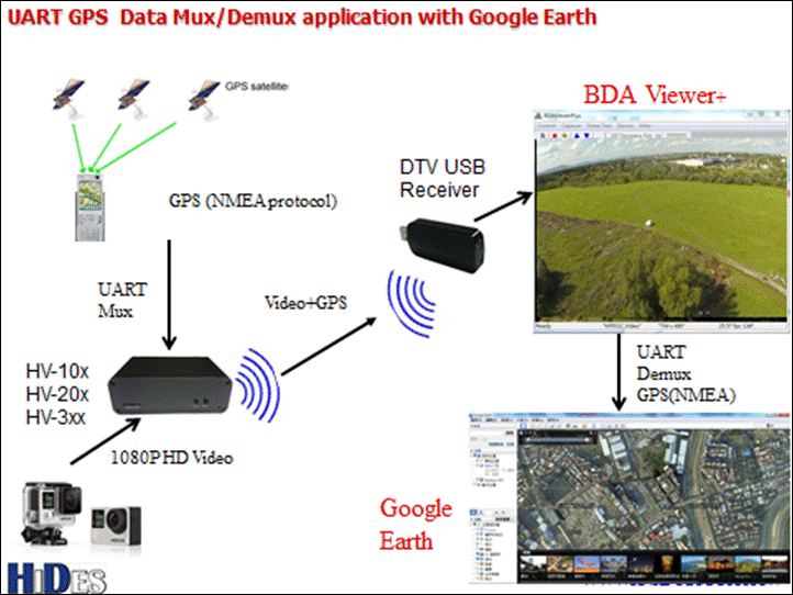 HV-320 supports UART data mux feature. GPS or aviation data can be multiplexed in the transmitted stream from HV-320’s UART port. Besides audio and video, the receiver can decode the received UART data for further data processing.