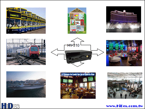 All DVB-T/ISDB-T/ ISDB-Tb compliant receivers**, including SetTopBox, Digital TV, PC/NB USB DTV dongle, or DTV capture card can receive, and watch the video from a HV-320 via the standard coaxial cable or antenna.